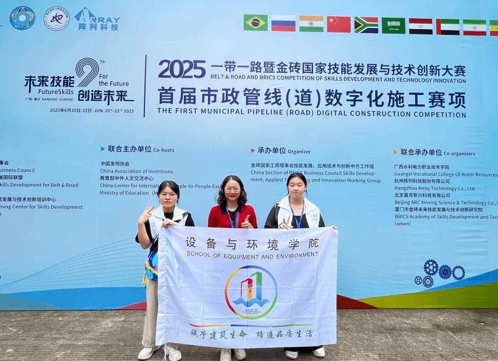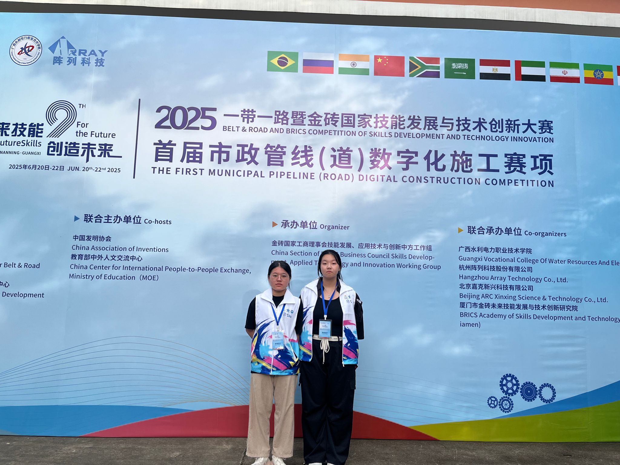 伟德国际1946源于英国设备与环境学院6月22日讯(文/梁幸子)2025年6月20日至21日,2025“一带一路”暨金砖国家技能发展与技术创新大赛首届市政管线(道)数字化施工赛项在广西水利电力职业技术学院举办,我院建筑消防技术专业2301班李硕、梁幸子同学参加了本次比赛。