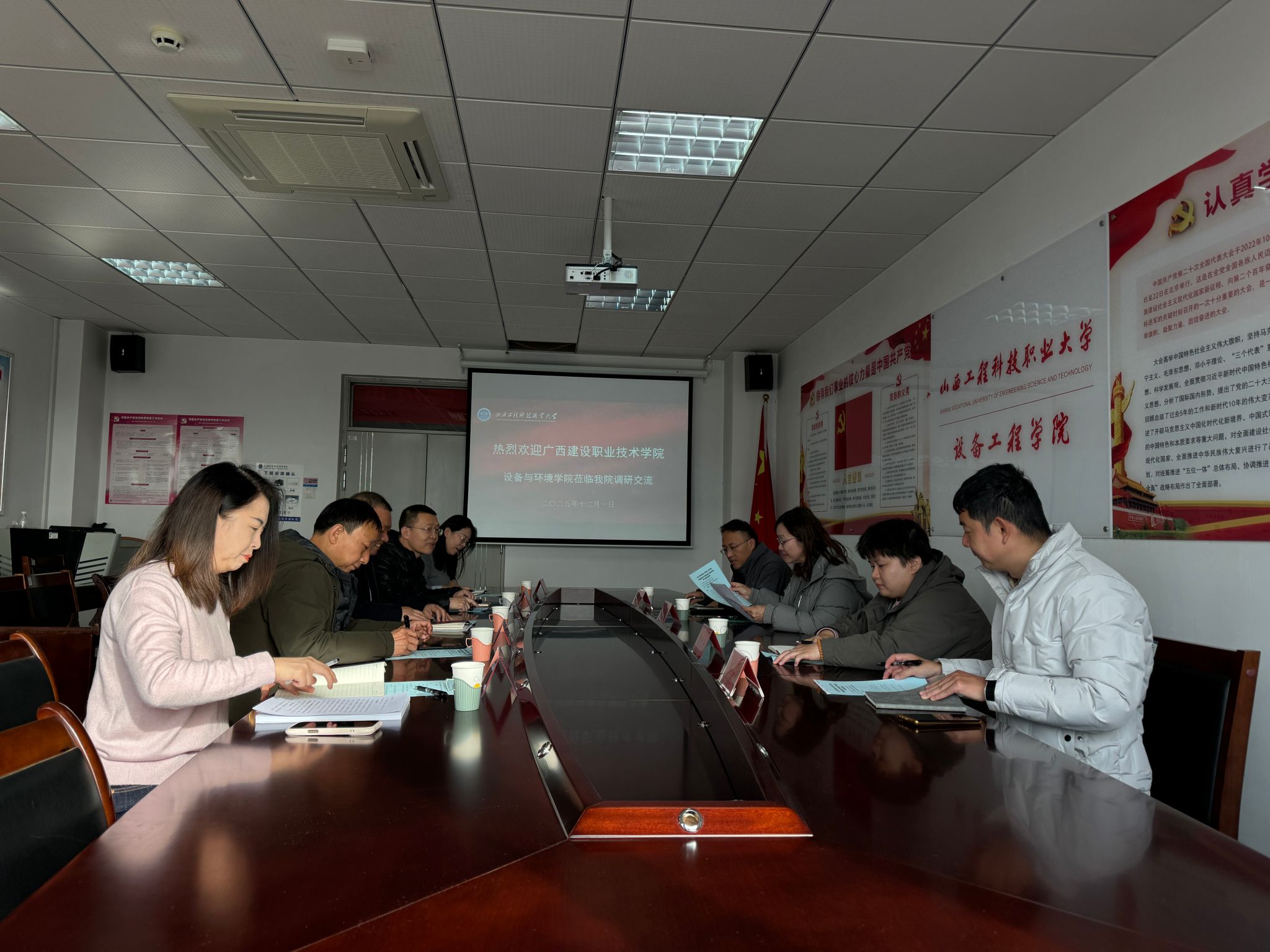 12月1日,在山西工程科技职业大学设备工程学院,双方首先共同参观了设备工程学院的实训基地与实验中心,实地了解其在产教融合模式创新、实训教学体系构建等方面的建设成就。参观结束后,双方在会议室召开交流座谈会,会上,全体人员集体观看了山西工程科技职业大学宣传片,全面了解该校办学历史沿革与特色发展路径。侯文淑书记在会上介绍了设备与环境学院的基本情况、专业设置及此次来访交流目的;山西工程科技职业大学设备工程学院陕晋军院长、丁俊发书记、高志勇副书记、郭欢副院长分别就学院整体办学情况、党建工作开展、团建及学生管理举措、职业本科专业建设经验等进行了详细介绍。双方围绕专业建设优化、人才培养模式创新、党建与思想政治教育融合等核心议题展开深入探讨,现场互动积极、氛围热烈,进一步拓宽了办学思路,为后续深化合作奠定良好基础。