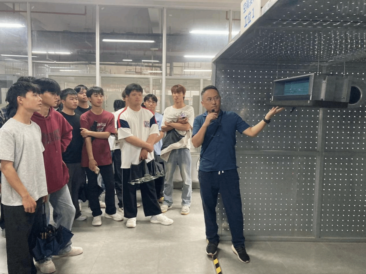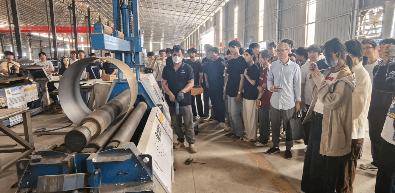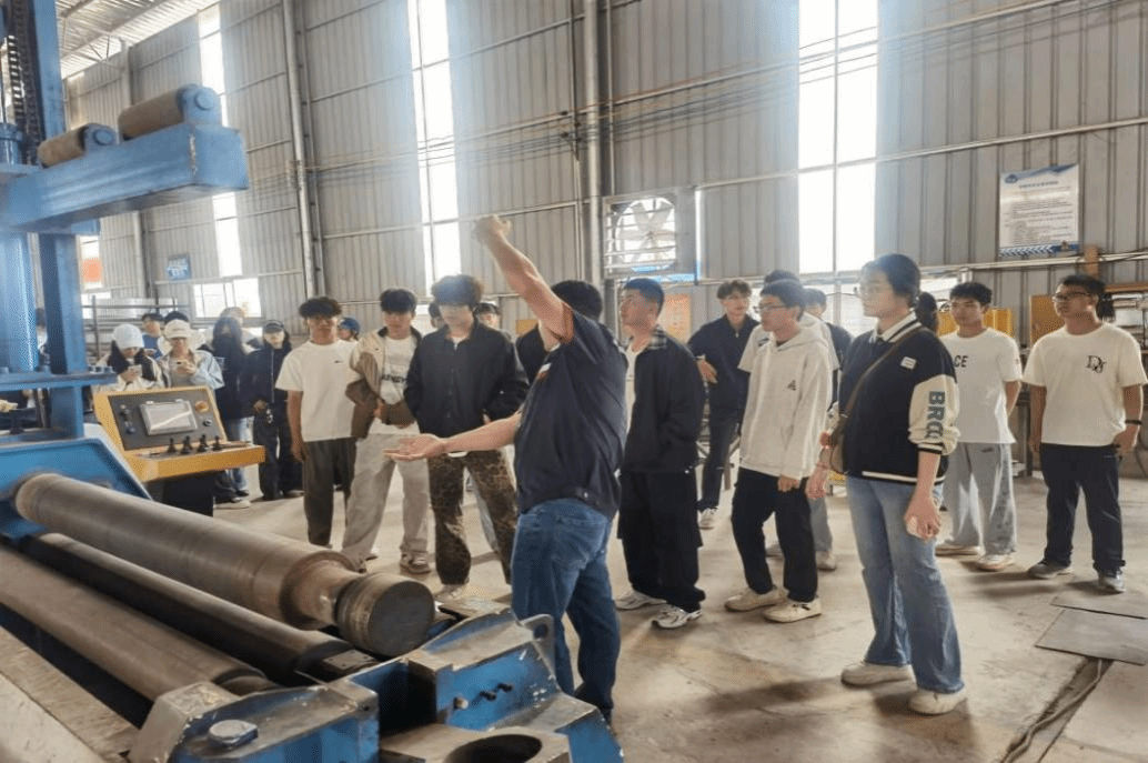 随后,同学们前往校企合作示范基地——广西永硕机电设备有限公司风管、风机生产工厂参观。在企业负责人和教师的讲解下,同学们近距离接触先进生产设备,亲身体验智能化风管生产工艺,观摩技术工人的规范操作,对风管、风机的生产流程与制造方法有了初步认识,为后续专业课程学习打下基础。