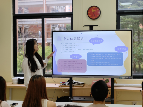 会上辅导员冀旭月老师结合2023年网络安全知识手册,分别从“网络安全法律法规体系、青年上网应警惕哪些网络威胁和风险、遇到网络安全威胁和风险如何保护自己”等三个方面入手,通过丰富多彩的幻灯片和真实生动的案例,引导同学们积极参与到网络安全的普及工作中来,努力营造清朗的网络空间与健康文明的网络发展环境,切实维护国家网络安全。