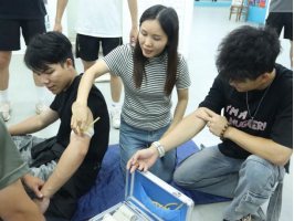 赛场上,各参赛队伍分工明确、配合默契:面对“坍塌区域”,队员迅速完成伤员转移,采用三人平托法将“伤员”稳妥安置至担架并固定;在心肺复苏环节,选手精准判断意识与呼吸,规范进行胸外按压与人工呼吸,5个循环操作一气呵成;止血包扎环节,队员熟练运用止血带与螺旋反折法,35秒内完成止血、70秒内完成前臂包扎;骨折固定环节,选手快速取夹板加垫,60秒内完成小腿骨折的“8”字形固定。