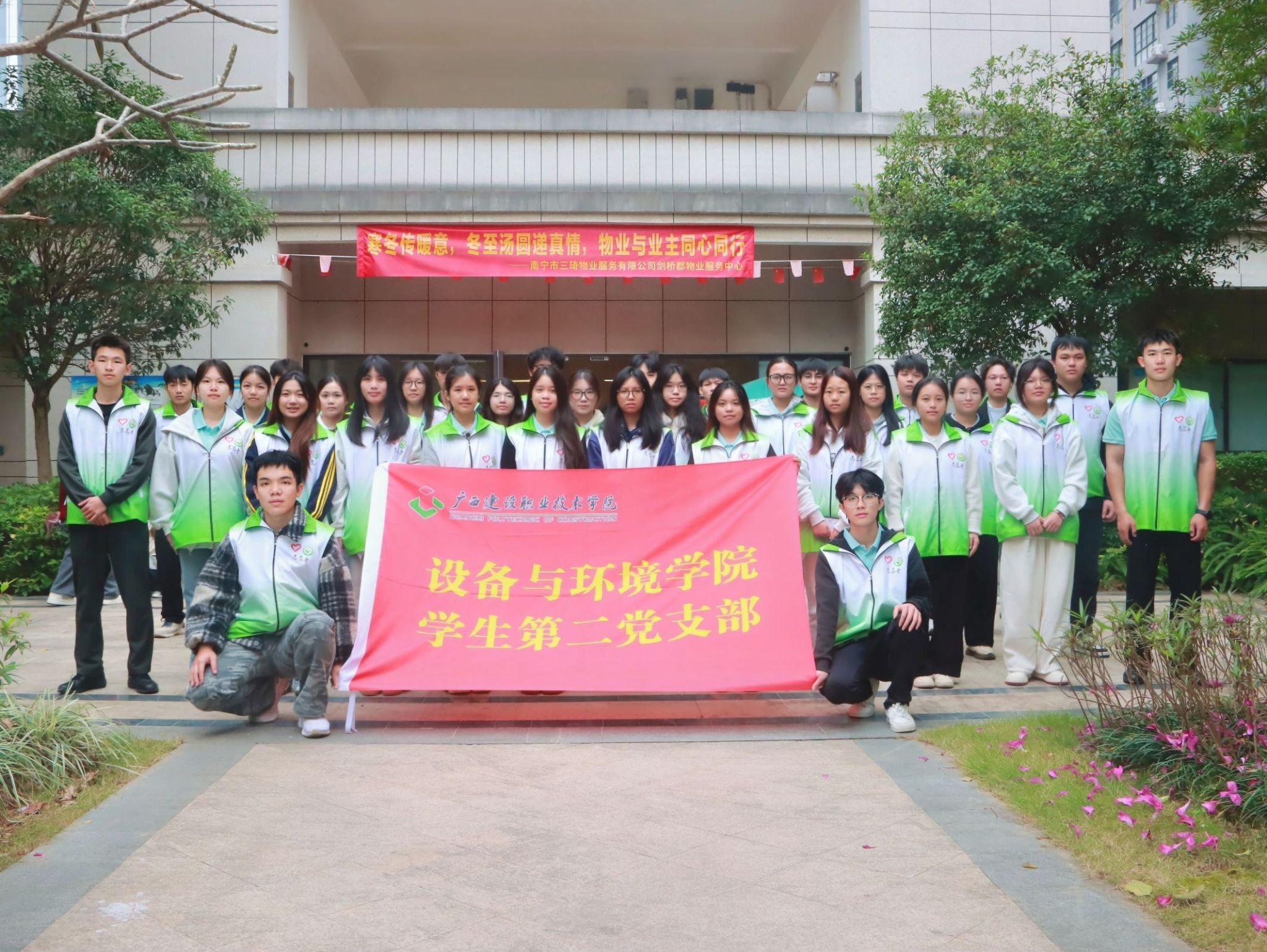 广西建院设备与环境学院12月23日讯(文/图 王翔 冀旭月)为充分发挥学生党员的先锋模范作用,扎实推进“我为群众办实事”实践活动,12月23日,设备与环境学院学生第二党支部组织全体入党积极分子走进南宁市西乡塘区骋望·剑桥郡小区,开展“先锋聚力办实事 青春同行暖社区”主题志愿服务。本次活动聚焦社区实际需求,通过环境整治与便民服务,引导青年学子在服务社会、奉献群众中锤炼党性、践行初心。
