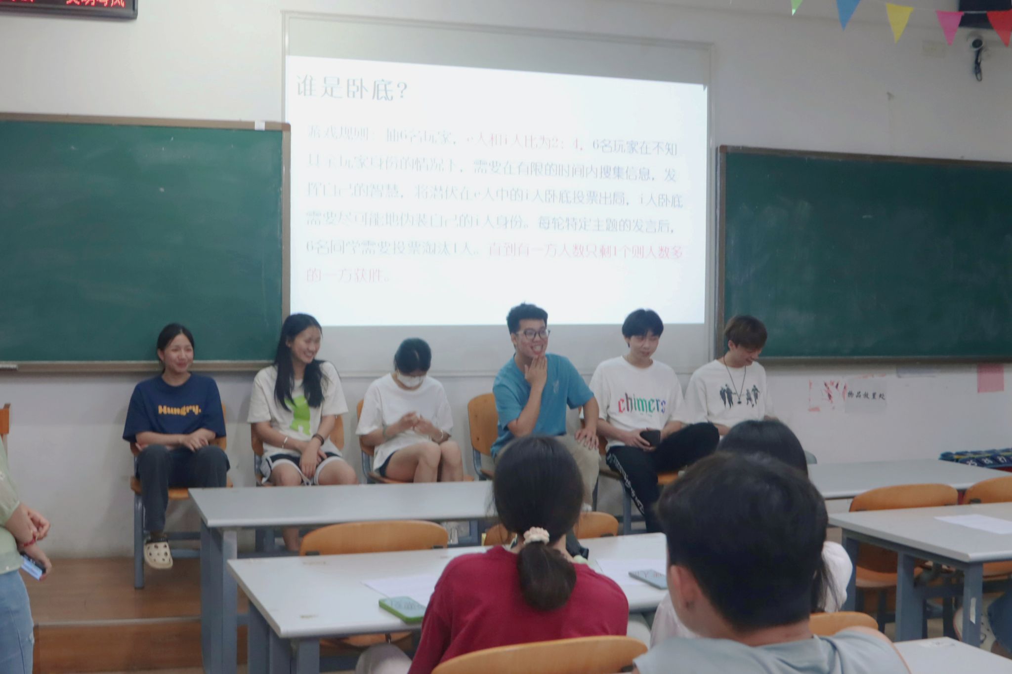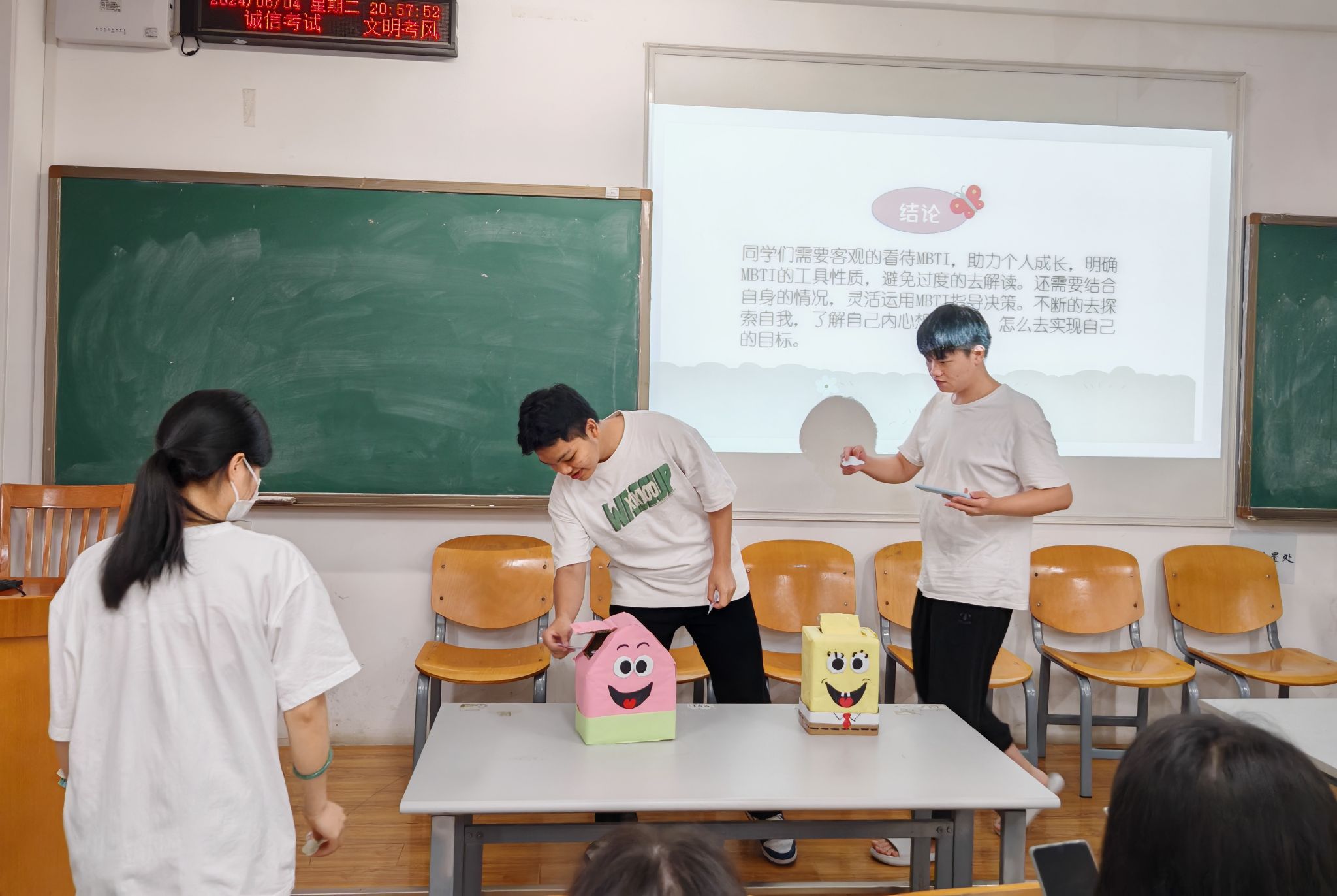 班会围绕当今网络热门话题“你是i人还是e人”展开。首先,辅导员先向同学们介绍MBTI理论及其应用的场景。随后,引导同学们打开抖音搜索“MBTI性格测试”,了解自己属于哪一类型的人格。测试完成后,大家将自己的人格写在便签纸上,投入盲盒。辅导员从盲盒中随机抽取一定比例的同学开展“谁是卧底”游戏。在游戏环节中,辅导员鼓励大家打破性格标签,大胆交流,展现自己。