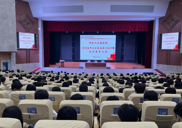 市政与交通学院7月16日讯(图/文 卢树华)7月14日下午,我院在礼堂召开2024届毕业生岗位实习动员暨安全教育大会,学院领导班子以及全体2021级学生、辅导员、班主任以及实习指导老师等参加了本次会议,会议由黄文珑副院长主持。