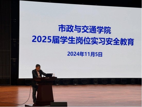 市政与交通学院11月5日讯(图/许大谦 文/何秉润)为更好开展我院2025届毕业生岗位实习工作,学院于11月5日在学校大礼堂召开了2025届毕业生实习动员暨安全教育大会,学院领导、全体教师及2025届毕业生参会。