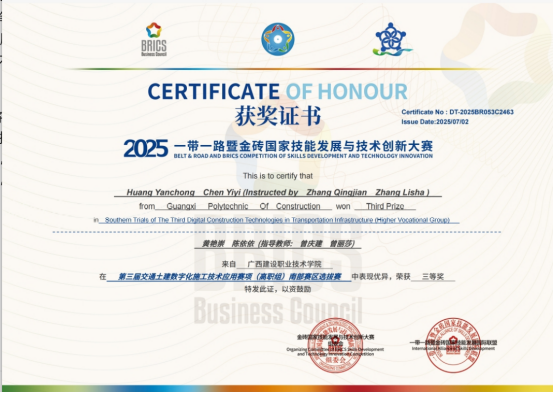 喜报!我院学子在2025年一带一路暨金砖国家技能发展与技术创新大赛第三届交通土建数字化施工技术应用赛项 (高职组)南部赛区选拔赛斩获佳绩