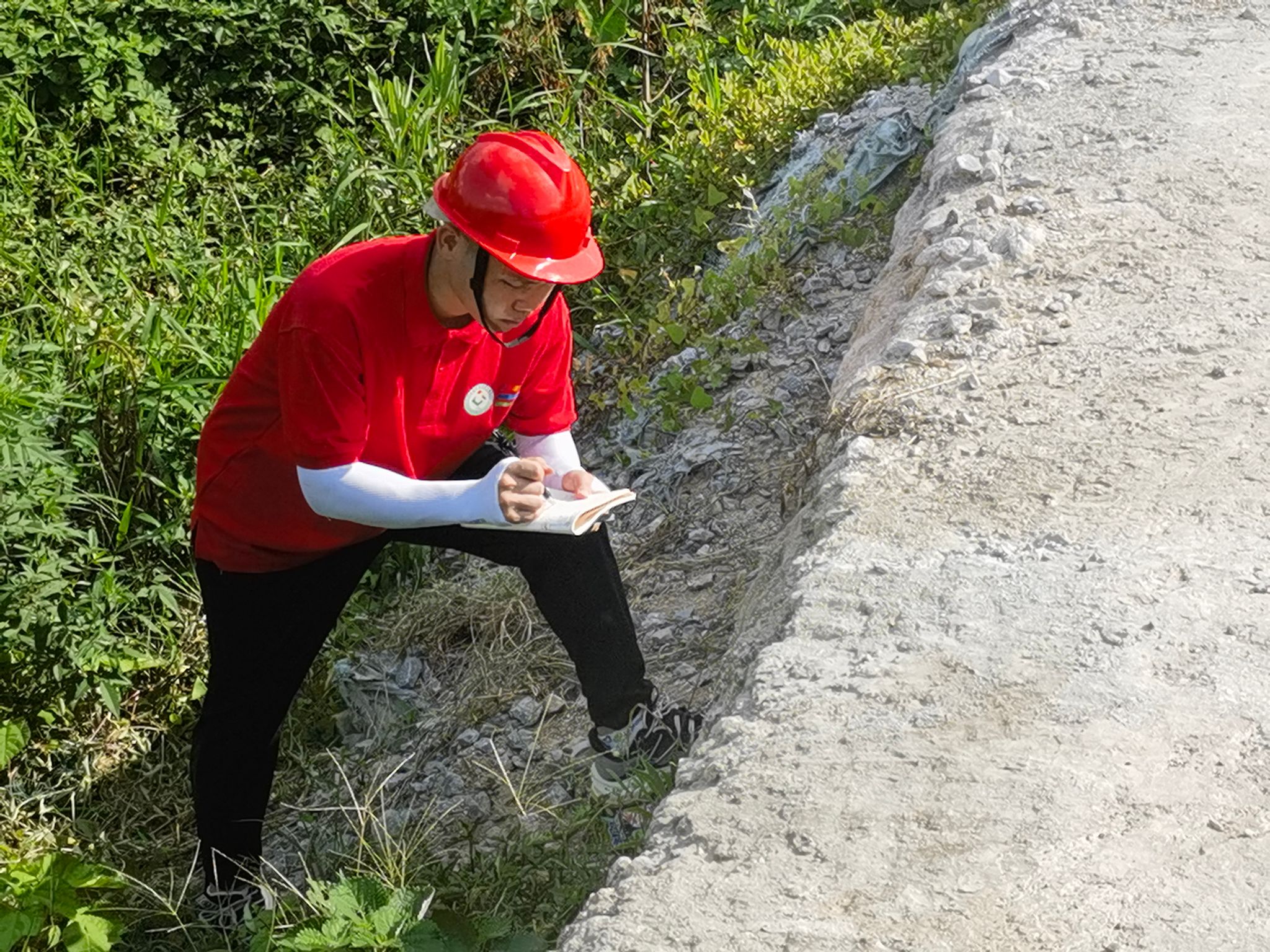 队员们分组对道路安全警示设置、护栏及边坡设置、路面平整度等情况进行现场勘测。队员们一丝不苟地进行勘测工作,遇到疑惑的地方积极向指导老师请教,指导老师结合现场情况给队员们上了一趟生动的“公路实践课”。