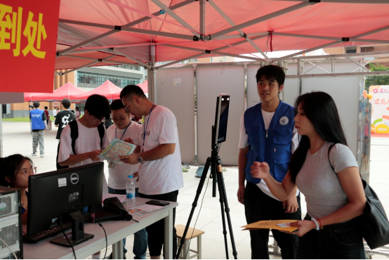 尽管天气十分闷热,也阻挡不了每一位志愿者的热情,学院在校门口设立了迎新指引点,当新生和家长一入校志愿者们便立刻微笑着迎上去,并热情帮助新生搬运行李,带领他们前往自己的学院大本营,校园内到处都是他们热情忙碌的身影。