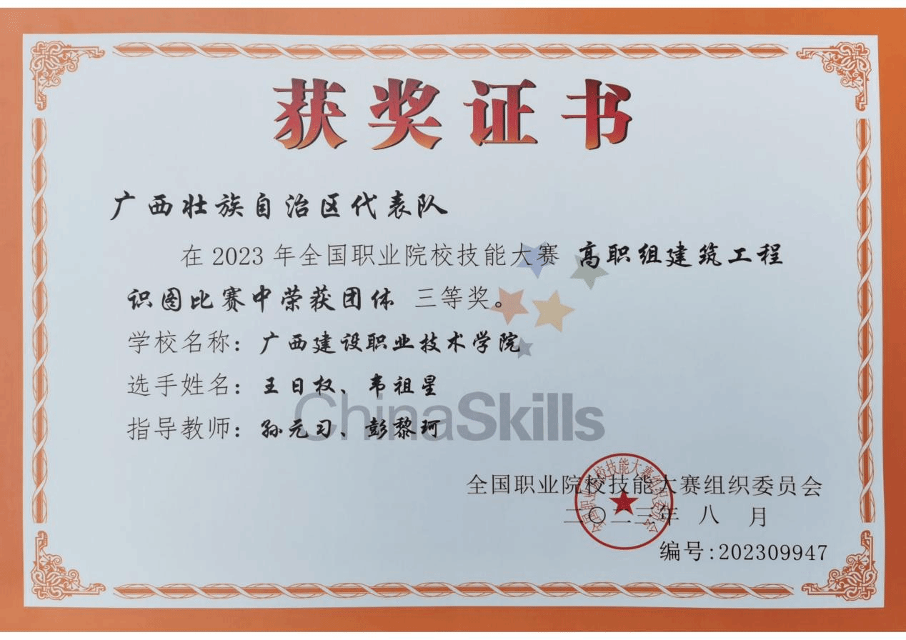 8月24日-28日,2023年全国职业院校技能大赛(高职组)建筑工程识图赛项在浙江建设职业技术学院举行。伟德国际官网王日权、韦祖星两位同学组成的代表队在孙元习、彭黎珂老师的精心指导下,以区赛第一的成绩获得国赛资格,经过奋勇拼搏、激烈角逐,再次斩获国赛团体三等奖。