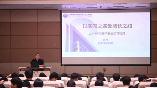 为加强学院毕业实习的过程管理和安全教育,明确实习要求,提升毕业生处事能力,培养其良好的安全行为习惯,掌握必要避险技能,提高自救互救能力,确保实习安全稳定,土木工程学院于2025年7月8日上午召开了2026届毕业生高建班毕业实习动员暨安全教育大会。