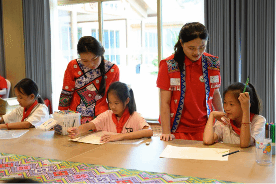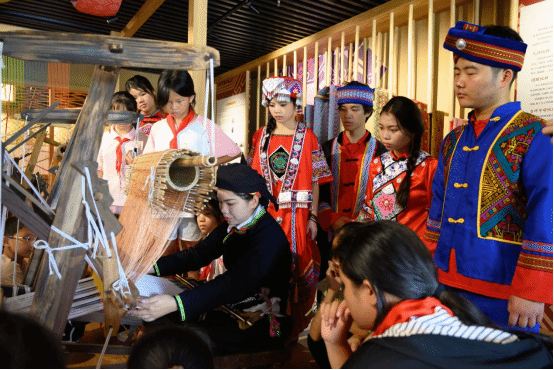 非遗传承:指尖技艺焕发新生。实践团创新打造“非遗+美育”特色课堂。天琴壮寨壮锦文化馆内,通过“传承人讲解+学生示范+儿童实践”的三级联动模式,让千年壮锦技艺焕发新生。同学们与当地儿童共同创作融合传统纹样与现代审美的壮锦作品,在寓教于乐中传承文化基因。