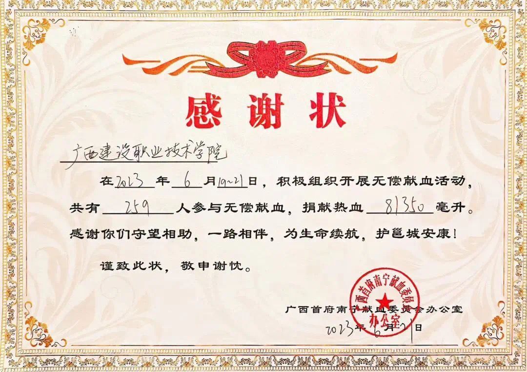 无偿献血活动的顺利开展,充分体现了建院学子的奉献精神和责任意识,展现了当代大学生的使命与担当,在校园内传递了满满的正能量。 热血倾注爱,真心汇聚情, 一份热血助他人,温暖人间洒真情,希望有更多的建院学子加入到无偿献血的队伍中来,奉献一份力所能及的爱心和温暖,为社会增添青春力量。
