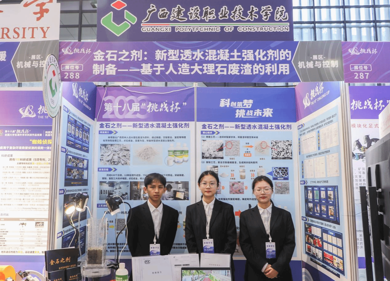 本届竞赛主体赛设特等奖117个,一等奖203个、二等奖377个、三等奖974个(含港澳作品)。由伟德国际官网付希尧、刘会平、曾小贵老师指导的项目《金石之剂:新型透水混凝土强化剂的制备——基于人造大理石废渣的利用》荣获全国终审决赛主体赛二等奖。这是伟德国际官网继2020年、2022年连续两届获得“挑战杯”中国大学生创业计划竞赛金奖后,第一次获得“挑战杯”全国大学生课外学术科技作品竞赛国家级奖项。