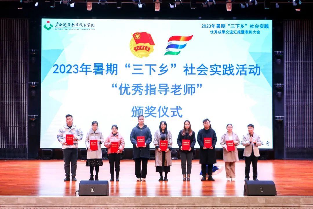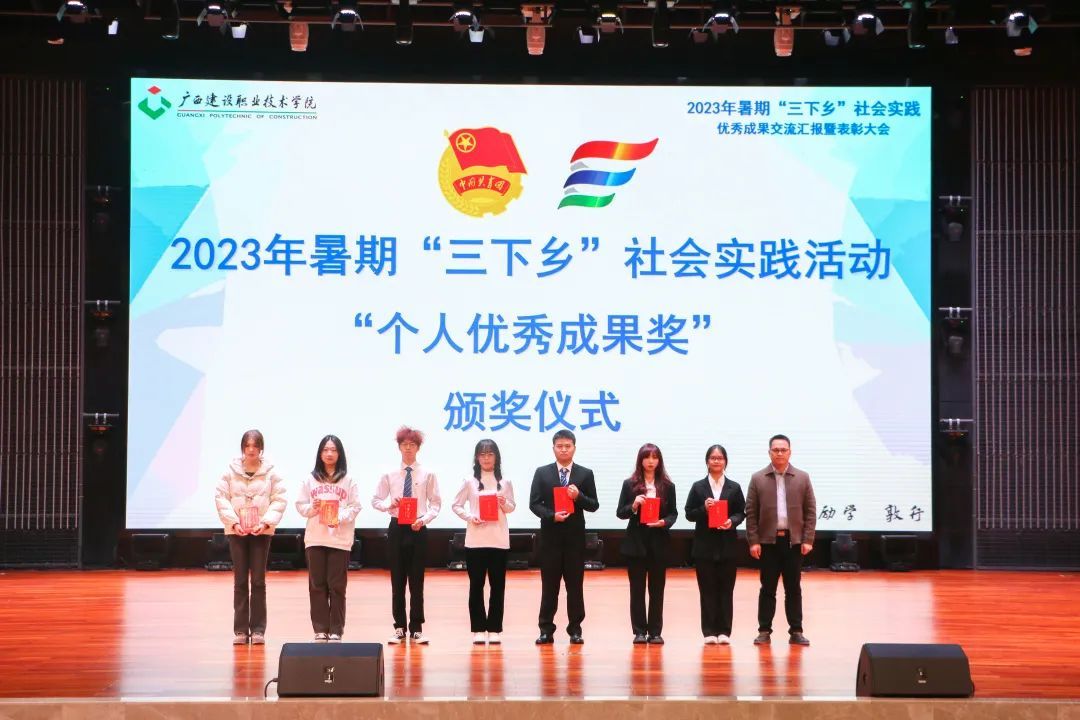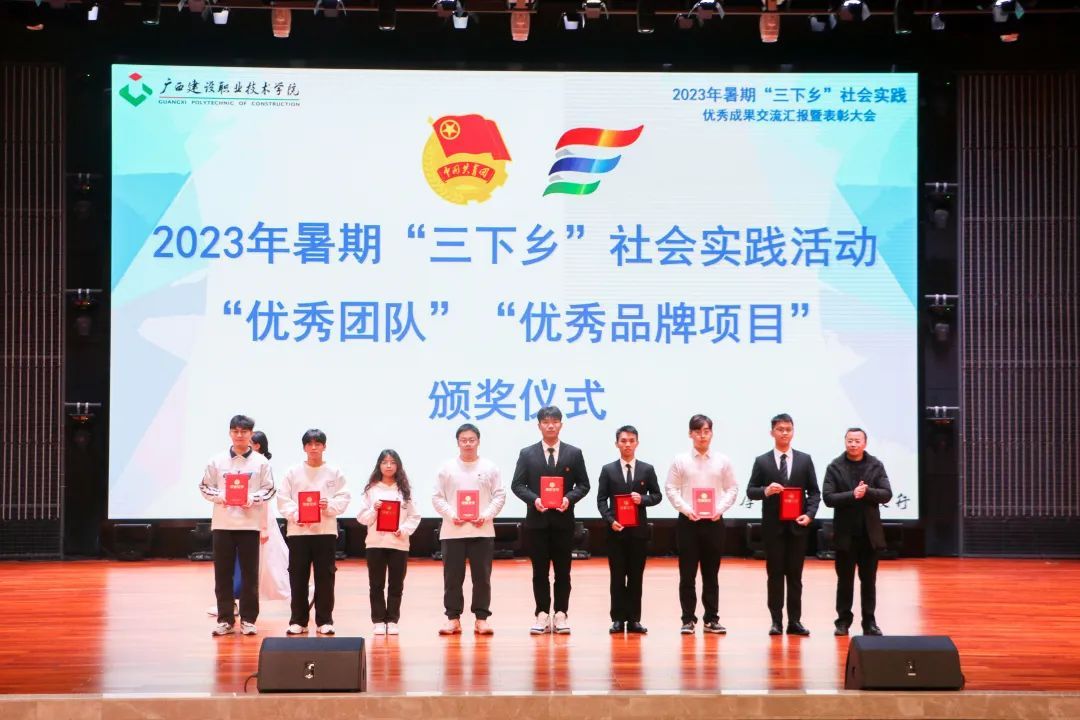 【青年新媒体中心报道】(团委 文/宋丽 周晓凤 图/覃小怡 谢梦莹)为总结暑期社会实践活动经验,巩固实践教育成果,树立榜样,表彰先进,进一步引导广大青年学生把课堂学习和乡村实践紧密结合起来,伟德国际官网团委于12月19日下午,在学校礼堂举行2023年暑期“三下乡”社会实践优秀成果交流汇报暨表彰大会。学校副校长伍耿清,校团委书记、学生工作部副部长曾小贵,各二级学院团总支书记出席大会,校团委全体老师、各实践团队指导老师代表及各二级学院师生代表参加本次大会。会上宣读了表彰文件。伍耿清副校长,曾小贵书记,唐红星书记分别为获奖集体及个人代表颁发奖牌及荣誉证书。
