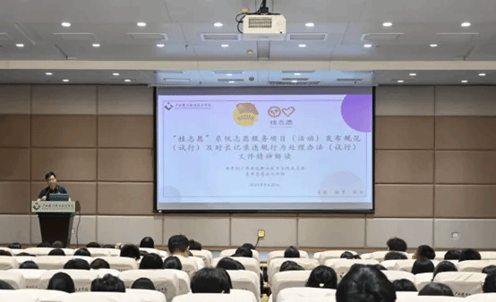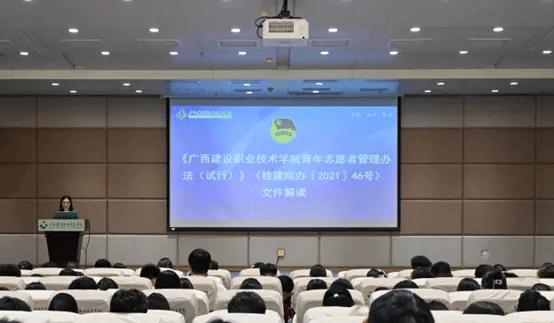 校团委韦江宁老师对“桂志愿”系统志愿服务项目(活动)发布规范(试行)及时长记录违规行为处理办法(试行)文件精神进行解读。他从“桂志愿”系统新增功能、试行规范及办法、违规行为处置、补录区别及注意事项五个方面进行讲解,让同学们进一步了解和熟悉“桂志愿”系统的主要功能与注事事项,加强对“桂志愿”系统的熟悉和掌握。