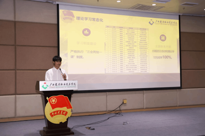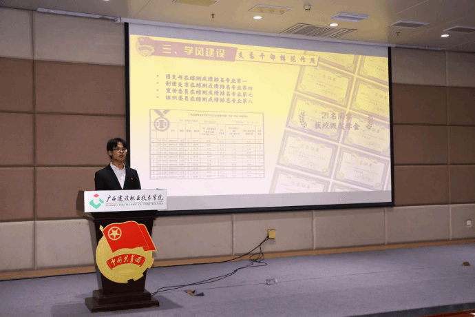 “红旗团支部”建管2304班团支部代表韦富成同学在展示评比活动现场