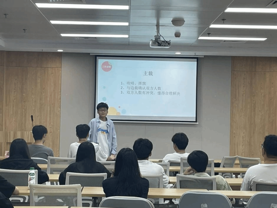 由文体活动部负责人黄渝峰同学来向大家介绍本次培训会的主要内容。会议通过PPT来向大家简单介绍了各工作人员所处岗位的主要职责,场地讲解以及比赛注意事项,并当场向大家示范队伍胜出后应该如何正确挥旗。介绍结束后,部分工作人员提出了自己尚有困惑的地方,都得到了逐一的解答。