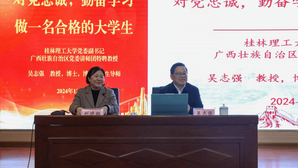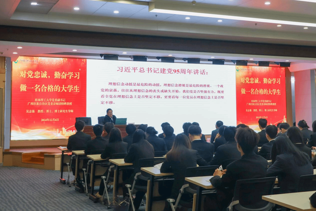 【青年新媒体中心报道】(团委 文/宋丽 谢湘宜 图/陈乃锦 李强)12月6日下午,桂林理工大学党委副书记吴志强教授在四教二楼报告厅为伟德国际官网“青马工程”骨干班学员讲授了一场主题为《对党忠诚,勤奋学习,做一名合格的大学生》的精彩讲座,学校党委书记刘晓红出席并主持讲座。党委学生工作部部长周舟,马克思主义学院党总支书记邱岚,团委书记曾小贵,以及校级“青马工程”骨干班全体学员参加讲座。