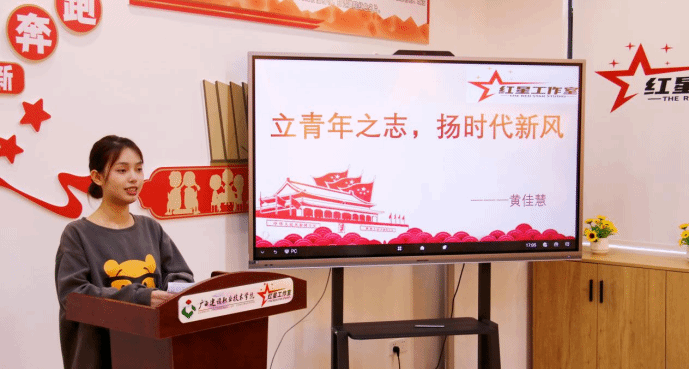室内2203班黄佳慧同学以“立青年之志,扬时代新风”为主题进行宣讲,号召当代青年学子不负韶华,不负时代,不负人民,在青春的赛道上奋力奔跑,争取跑出当代青年的最好成绩。