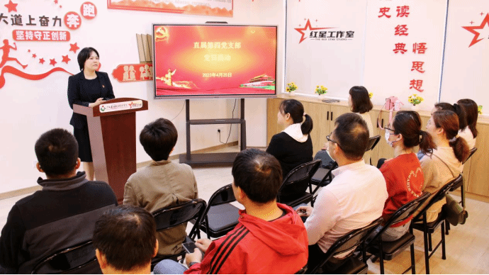 为深入学习贯彻习近平新时代中国特色社会主义思想和党的二十大精神,4月25日下午,直属第四党支部到位于2号学生公寓的红星工作室开展主题党日活动,活动由支部副书记黄秀薇主持。