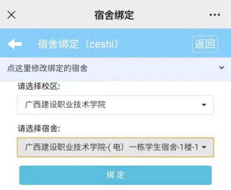 3.进入系统点击“电费实时在线充值”进入电费管理页面,点击“宿舍绑定”选择要充值的宿舍后点击“绑定”(图3图4所示)。