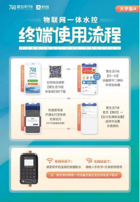 使用流程:点击我的,随后登录账号选择“支付宝授权登录”→设置交易密钥→扫热水终端的二维码转接到使用设备界面点击立即使用或在热水终端屏幕输入账号绑定的电话号码点击“确定”键后输入密钥→热水终端按“启动暂停”键即可使用热水→在热水终端按“按3秒结算”键或在“慧生活789”APP热水使用界面点击“立即结算”即可扣费成功。