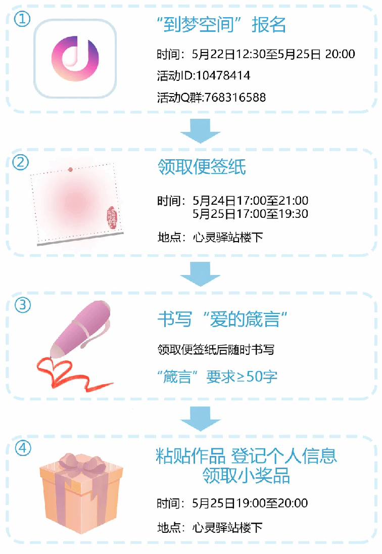 参与人员携带写好的便签纸于5月25日19:00-20:00,前往心灵驿站楼下,核对登记个人信息后将便签交于工作人员进行粘贴,并领取活动小礼品。
