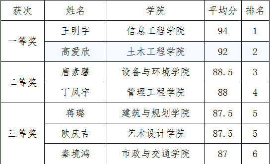 经各参赛选手演讲,评委打分,此次大赛共产生一等奖2名、二等奖2名、三等奖3名。比赛结果名单如下: