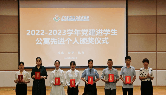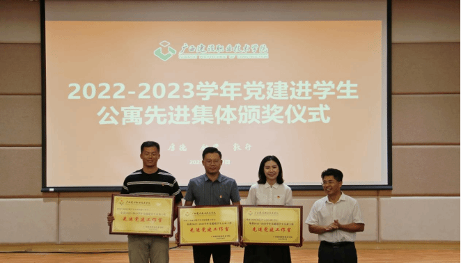 在首先举行的2022-2023学年度党建进学生公寓工作表彰大会上,学工部宿管科科长陆洪先宣读表彰文件,副校长伍耿清和学工部部长周舟分别为2022-2023学年度党建进学生公寓先进集体、先进个人代表颁奖。