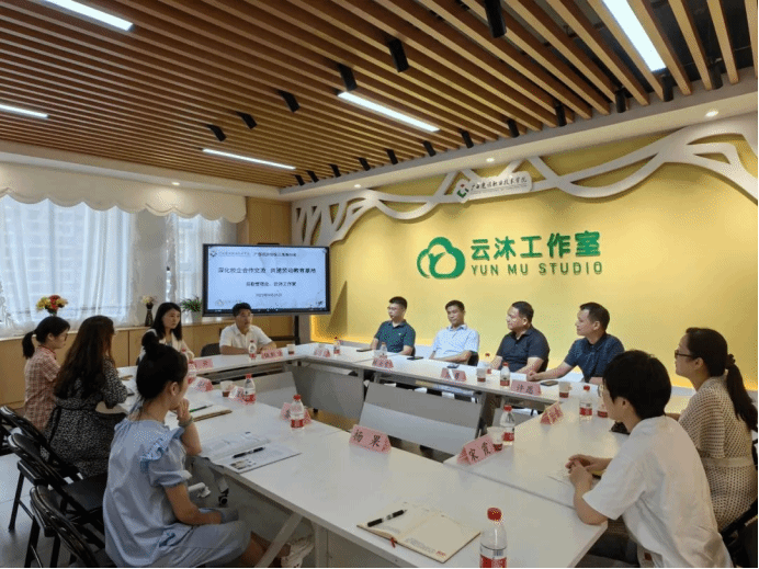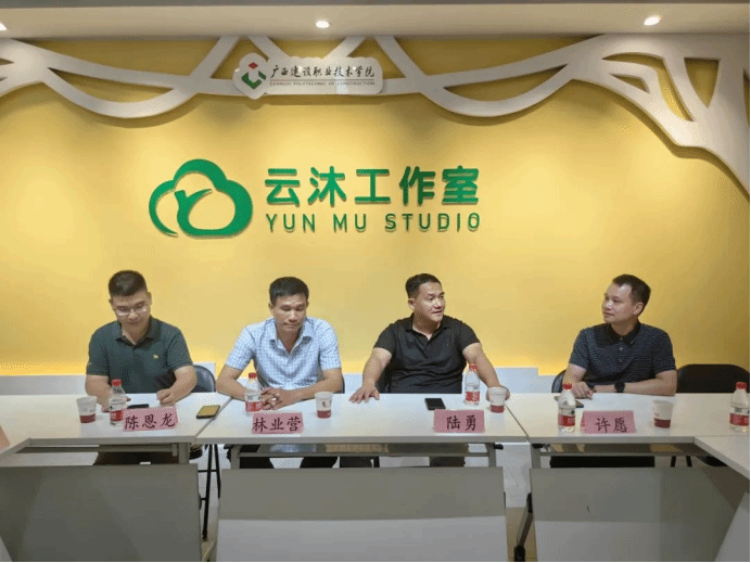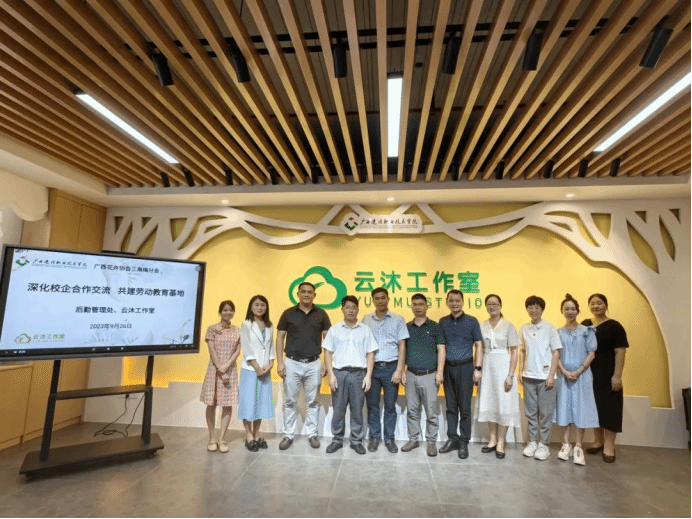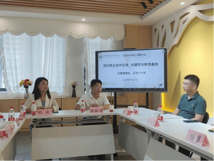 揭牌仪式结束后,伍耿清副校长以及广西花卉协会三角梅分会陆勇秘书长等一行人,前往云沐工作室开展座谈交流。云沐工作室主持人刘云介绍了工作室的基本情况和建设方向,表达了未来与行业协会加强合作交流的意愿,全力打造“党建红”引领“园林绿”促进“校园美”思政品牌。学校伍耿清副校长对共建劳动教育实践基地给予肯定,指出这是学校积极构建“五育并举”育人体系,推动劳动教育赋能学生发展的重要举措。他强调,劳动教育使学生树立正确的劳动观点和劳动态度,培养劳动技能,热爱劳动,养成劳动习惯,它既是“立德”的重要内容,也是“立德”的途径。希望云沐工作室发挥师生和合作企业的专业优势,在优化校园育人环境,提升学生实践能力等方面发挥更大的作用。同时,要深化校企合作,不断拓展合作空间,形成校企资源共享,优势互补良好局面,联合培养专业化人才。