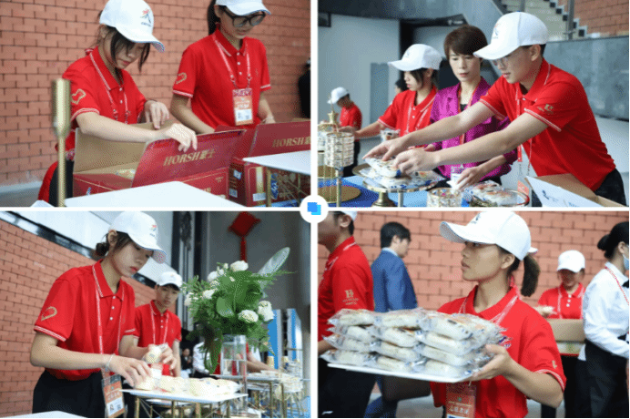 为了给来宾留下好印象,协助茶歇的冼鑫同学早早就奋战在自己的岗位上,准备饮品、水果装盘、糕点摆放都干干净净、精美大方。她一边回收纸杯一边说:“虽然我的工作不起眼,但看着外宾们在茶歇区交流谈话,对糕点赞不绝口,心里就像家里来了客人一样开心。”