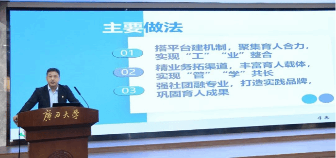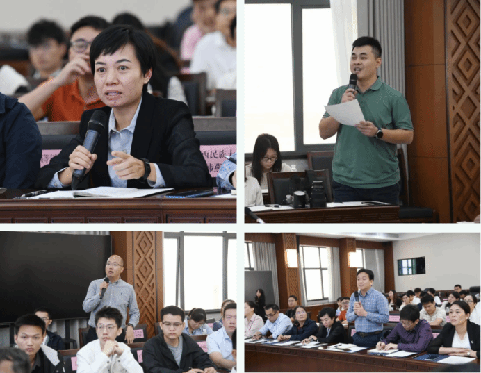 随后,大家来到广西大学君武馆玉林厅,围绕本期论坛主题《“学工”与“学业”的整合融合》开展交流研讨。10名老师从学工视角出发,探索学生工作与学业促进的路径方法,聚焦学生工作如何在促进学生专注学业、提升学生学习能力、指导学业生涯规划等方面问题开展深入研讨。参会老师就相关内容即兴向主旨发言老师提出问题进行交流。