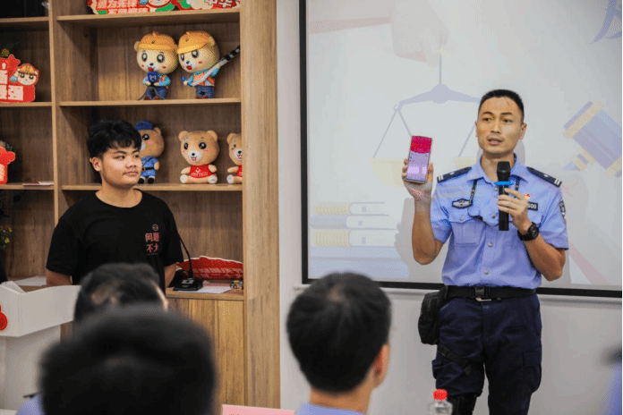 随后,大家前往学生社区安全协作中心开展座谈会。座谈会上,警官们依次为反诈宣传志愿小队的同学们讲授防范电信诈骗的重点和要点,以及“国家反诈中心”APP的使用方法。