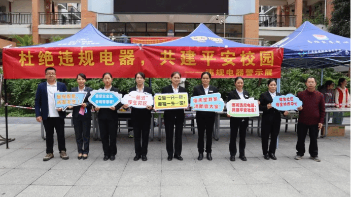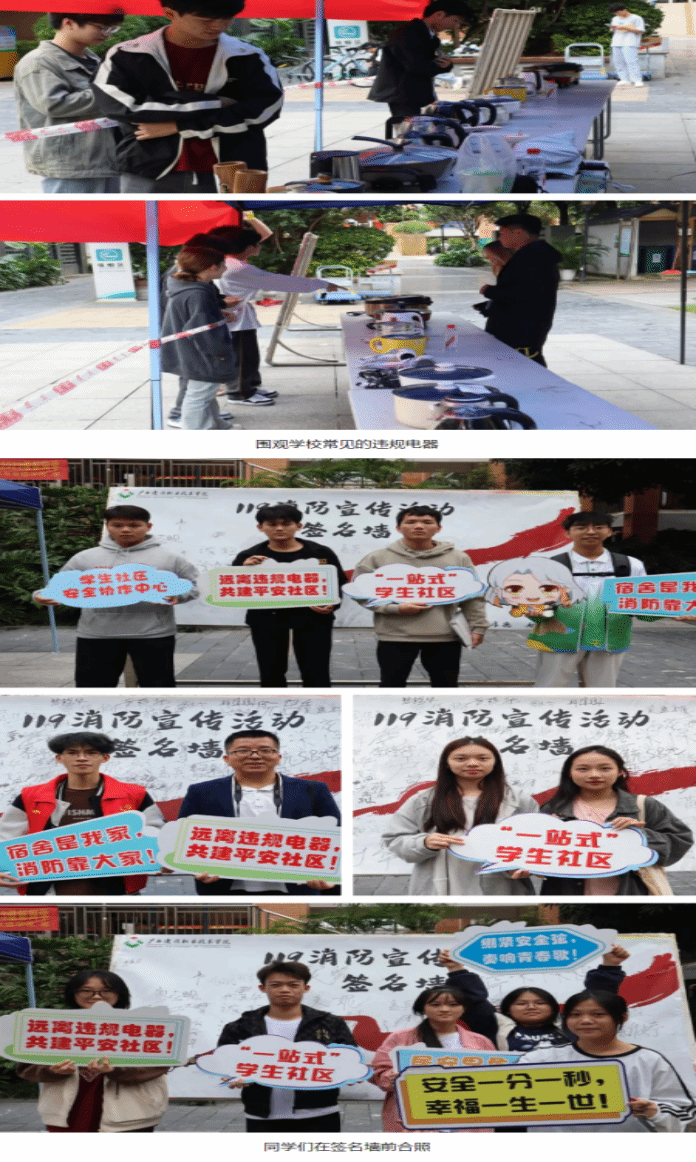 在学生宿舍内使用违规电器是常见的宿舍安全隐患之一。违规电器展示吸引了不少同学驻足观看。校宿管会的同学们和物业宿管员们详细向同学们讲解违规电器的种类,使用违规电器的安全隐患,提醒同学们注意宿舍用电安全,遵守学校纪律,严禁在宿舍使用违规电器。