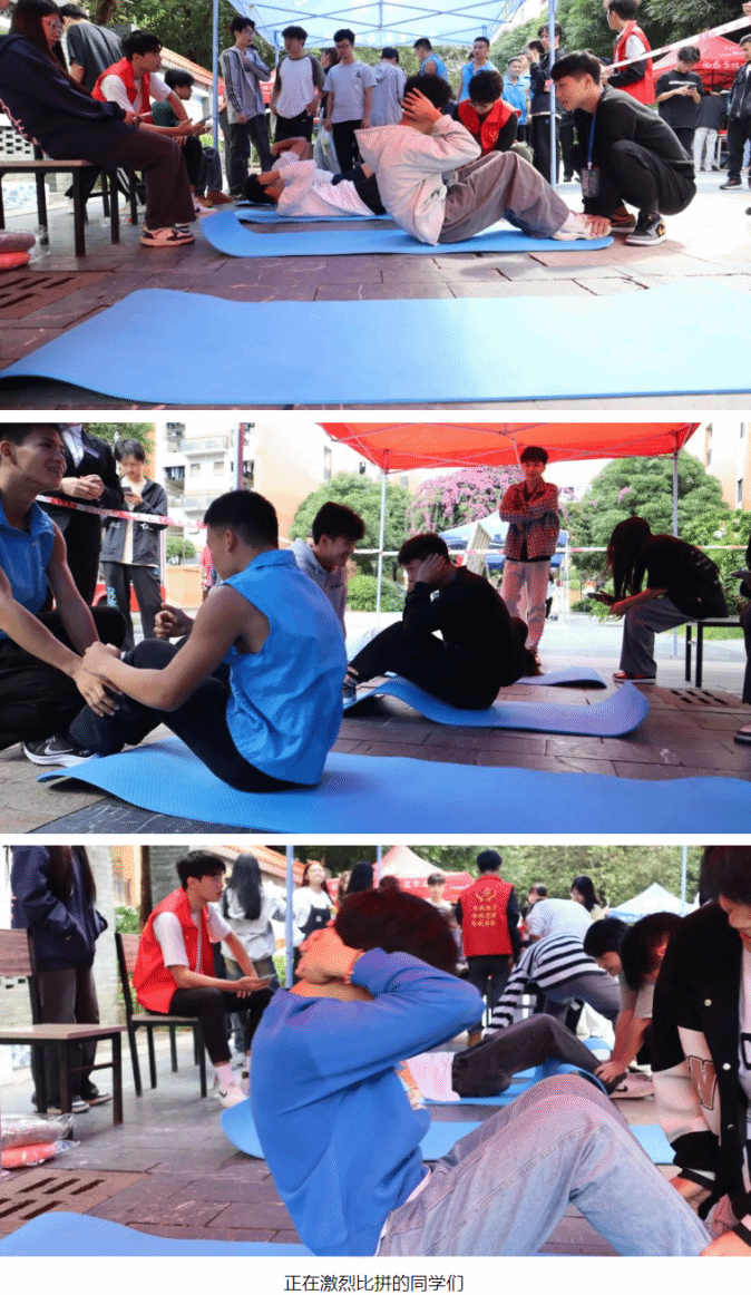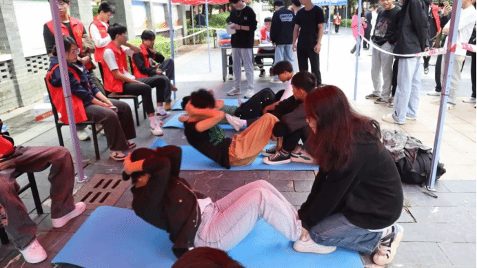 本次体能竞赛主要比拼的是仰卧起坐,按照不同难度分级设置奖项。参与竞赛的同学们根据自身能力进行难度分级挑战。在热烈的加油声中,同学们热情满满地开启挑战,全身心投入项目比拼中。