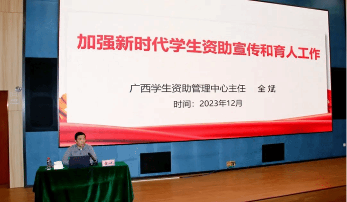 讲座中,全斌主任围绕我区学生资助体系、如何做好学生资助宣传工作、全面加强资助育人工作等三个方面,详细介绍了国家资助政策的发展历程和我区高校资助工作的开展情况,深刻阐述了开展学生资助工作的重大意义、做好学生资助宣传工作的要点和原则、资助育人的理论框架和具体措施。他指出,资助只是手段,育人才是目的,要在落实立德树人根本任务、推动资助育人上力行;要构建物质帮助、道德浸润、能力拓展、精神激励、心理救助有效融合的资助育人长效机制,着力培养受助学生自立自强、诚实守信、知恩感恩、勇于担当的良好品质。