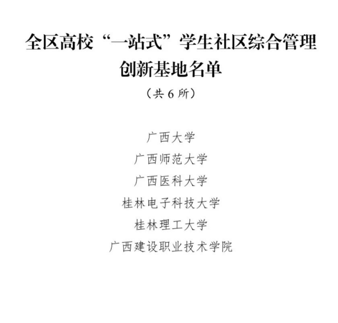 学校入选第一批全区高校“一站式”学生社区A类建设单位;1个工作案例入选全国高校“一站式”学生社区风采展示活动优秀案例(全区共3个案例入选);3个工作案例入选全区高校“一站式”学生社区综合管理模式建设工作精品案例50强,其中1个案例综合评价位列“党建引领”版块全区高校第一,2个案例综合评价分列“三全育人”“平安社区”版块全区高职高专第一 ;在2020—2023教育部阳光高考信息平台“职业院校学生满意度”排行榜上连续四年名列广西榜首;社区建设经验吸引了广西区内外近50所高校到校考察交流。