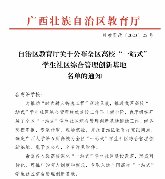 (文/黄楚凌)11月23日,自治区教育厅公布全区高校“一站式”学生社区综合管理创新基地名单,伟德国际官网成功入选。本次遴选工作经全区高校申报、专家评审、现场核验,并报自治区教育厅党组同意,最终确定6所高校为全区高校“一站式”学生社区综合管理创新基地,伟德国际官网是入选的唯一高职高专。