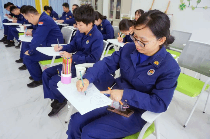 授课中,消防指战员在秦老师的指导下体验音乐放松操、情绪绘画等活动,放松心情、舒缓压力,随后集中学习心理疾病的成因及缓解心理危机和心理压力的技巧。