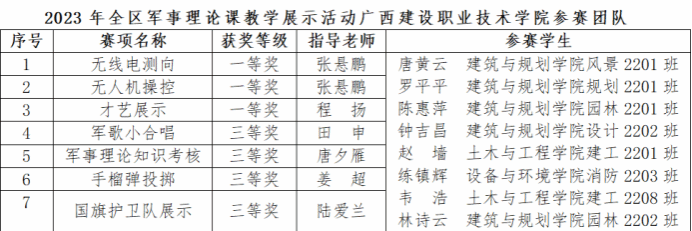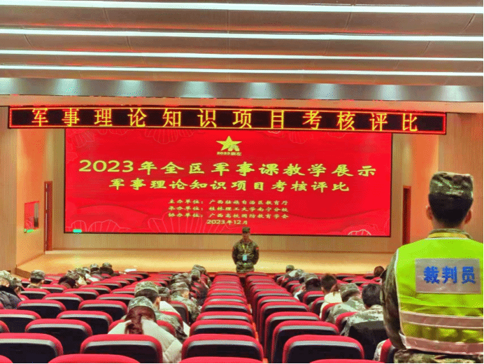 (文/张悬鹏)12月17日至22日,由自治区教育厅主办,桂林理工大学南宁分校承办,广西高校国防教育学会协办的2023年全区军事课教学展示活动在广西崇左落下帷幕,共有来自全区23支代表队参加。活动围绕《军歌小合唱》、《电磁频谱管控—无线电测向》、《军事理论知识考核》、《无人机操控》、《手榴弹投掷》、《国旗护卫队展示》、《才艺展示》等7项军事课,开展现场展示和竞技比赛。