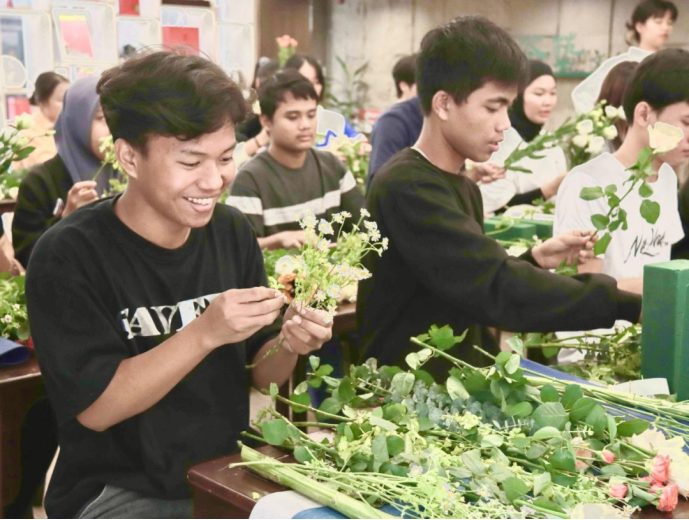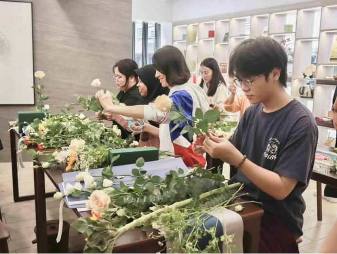 在茶艺文化传习基地,插花师为留学生们介绍了中国插花的起源、插花理念、插花技巧、色彩搭配、花艺风格等花艺知识。留学生们一边认真学习,一边进行插花实操,制作花束时,大家各显本领,脑洞大开,根据美学知识和自己的喜爱偏好,创作出了带有个人风格的花束,看着自己精心创作的花艺作品,留学生们都露出了开心的笑容。