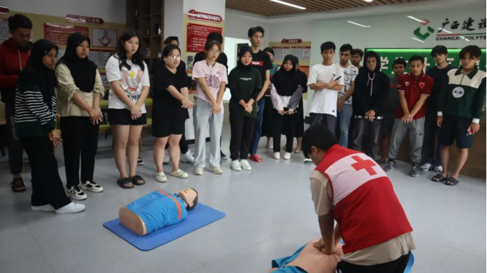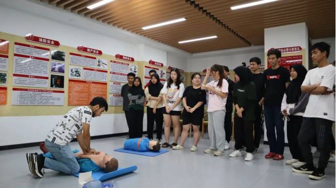 在学生社区安全协作中心,培训老师为留学生们介绍了红十字运动的起源和国际红十字精神等内容,并利用模型演示了心肺复苏(CPR)操作流程和自动体外除颤仪(AED)具体操作方法。留学生们认认真真按照规范流程进行实操练习,“01、02、03、04……”大家按照胸外按压30次,人工呼吸2次的规范流程重复“施救”,最后看到自己成功“救醒”了别人,为掌握了一项救护技能而感到高兴。