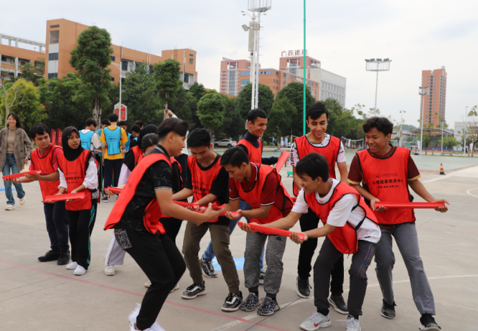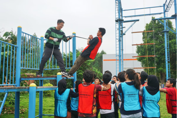 在心理素质拓展基地,留学生们分为两支队伍进行能量传输、不倒森林、呼啦圈传递、激情节拍、信任背摔等活动。在激情节拍环节,所有队员围成一个圈,左右间隔15-20厘米,脸朝内侧,然后伸出双手,拍左右队友的肩膀,拍一下喊出第一个字,以此类推,用击掌的方式喊出“我们是最棒的”,激发了队员热情,释放自身能量。心理素拓活动在欢声笑语中落幕,大家都说活动让身在异乡的学子对学习与生活充满了期待。