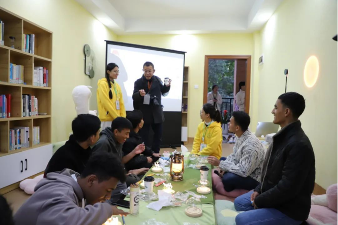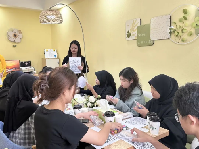 在学生社区心灵驿站,心理中心老师先向留学生们讲述了艺术治疗在心理健康教育中的重要意义和作用,接着一步步讲解小夜灯制作步骤。在小夜灯填涂颜色过程中,一块玻璃从空白逐渐变成了色彩缤纷的作品,当插上灯座的瞬间,留学生们不禁发出“好漂亮”的感叹,并纷纷表示要将作品带回自己国家送给家人。特色茶歇后,留学生与伟德国际官网四叶草学生团队用中英双语沟通互留联系方式,迫不及待想要参加下一期活动。