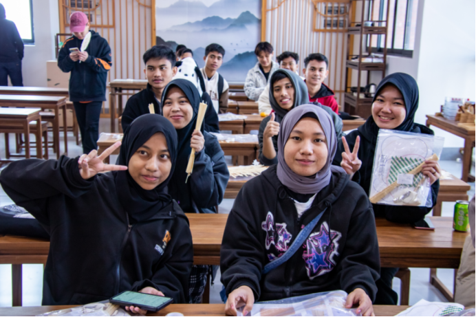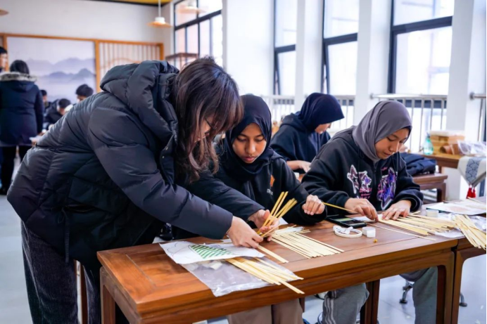 在民族文化传承基地,陈菲菲副院长带领留学生们进行参观,并介绍了瑶族非遗藤编技艺。留学生们在教学指导下按照“挑二压二”的方法进行穿织、穿插竹篾,编好后用笔将想要的轮廓画出来并进行裁剪,再用棉布对扇子边缘进行包边,大家对自己亲手制作的竹扇爱不释手。活动过程中,伟德国际官网师生还为留学生们准备了热气腾腾的饺子,共迎冬至,让他们在异国他乡过得暖意融融。