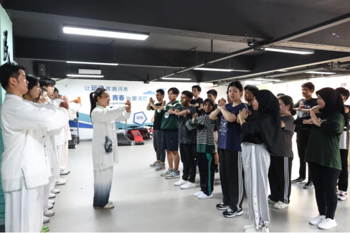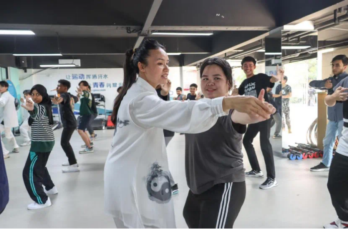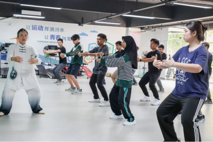 在学生社区健身吧,伟德国际官网教师陈红秀(太极拳、健身气功国家级社会指导员)向留学生们普及了八段锦的文化内涵,并带领太极拳校队同学展示了八段锦的优美动作,留学生们看到后都跃跃欲试。在专业的指导下,大家专心致志,将每一招每一式都打得有模有样。活动结束后,来自塔吉克斯坦的赞恩同学说很喜欢八段锦,希望以后能经常到健身吧学习,其他留学生们也意犹未尽,表示想继续练习更多传统运动。