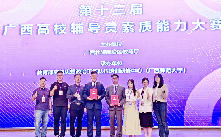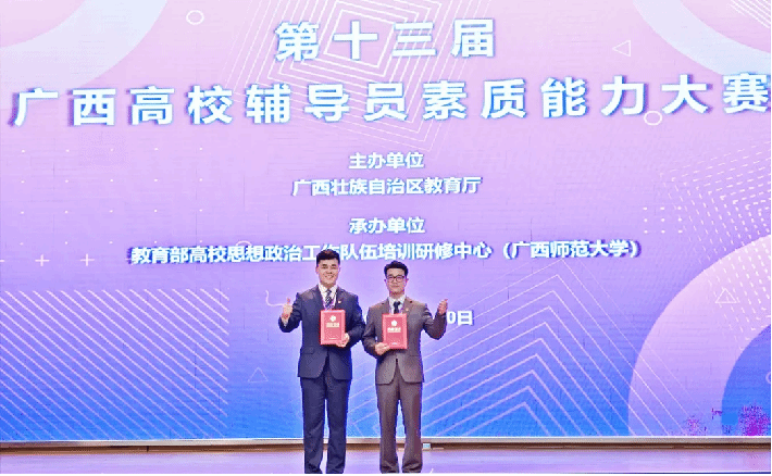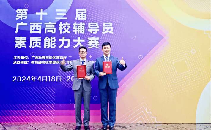 4月18日至20日,由自治区教育厅主办、教育部高校思想政治工作队伍培训研修中心(广西师范大学)承办的第十三届广西高校辅导员素质能力大赛在广西桂林落下帷幕,共有来自全区79所高校的108名优秀辅导员参赛。经过激烈角逐,伟德国际官网管理工程学院宋景弘老师和艺术设计学院张悬鹏老师双双荣获大赛一等奖!