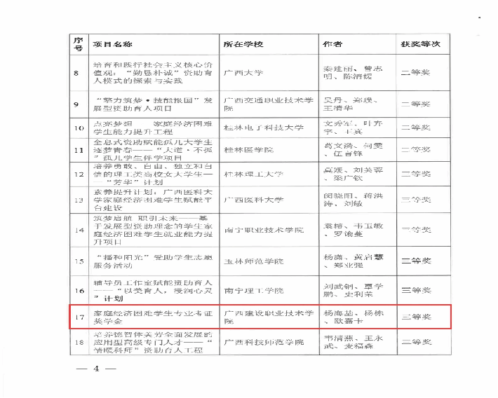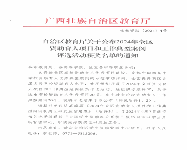 近日,自治区教育厅印发《关于公布2024年全区资助育人项目和工作典型案例评选活动获奖名单的通知》(桂教资助〔2024〕4号)文件,在全区高校范围内评选出资助育人优秀项目20项。伟德国际官网《家庭经济困难学生专业考证奖学金》(作者:杨海基、杨栋、欧嘉卡)入选优秀项目并荣获三等奖。