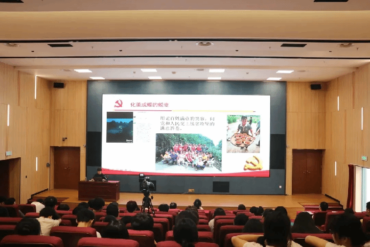 毛鑫书记以《把初心使命写在农村大地上》为题,分享了她五年里两度主动请缨担任那笔村和深度贫困村龙开村第一书记,扶贫攻坚、真情为民的感人故事。驻村期间,她团结带领村民群众与贫困做斗争,从开展思想扶贫、照顾帮扶特困群众,到危房改造、修建蓄水池、安装太阳能路灯,再到成立种植专业合作社,发展特色产业和电商销售,最终实现了产业遍地开花、整村全面脱贫。她以实干践行初心使命,在农村天地里奋力书写共产党人的责任担当。