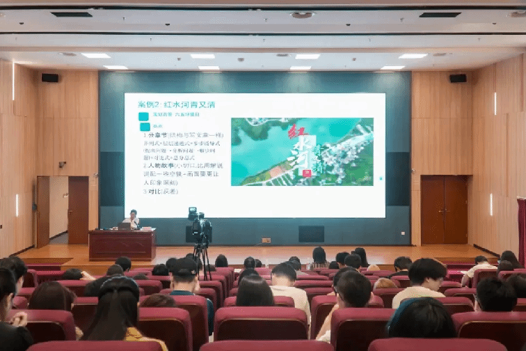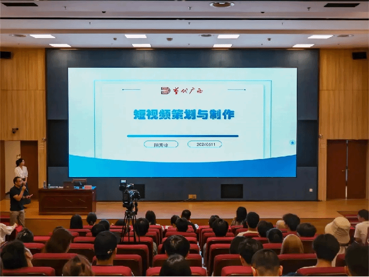 阳秀琼主任凭借自身丰富的实战经验,用浅显易懂的语言与大家分享了短视频的类型概念、短视频策划的关键要素、短视频主题与风格匹配选择、如何使用丰富的表现手法、参与度和互动性的提升等制作经验,包括剪辑节奏与叙事结构、特效与动画制作、音频编辑与混音、色彩校正与调色等后期制作技巧,同时结合当前年度热门事件教会大家梳理寻找优秀的短视频创意,并对《这就是广西酸嘢》《红水河青又清》等成功案例进行了效果评估与数据分析,整场讲座内容丰富、案例鲜活、生动精彩,受到了师生们的一致欢迎和好评。